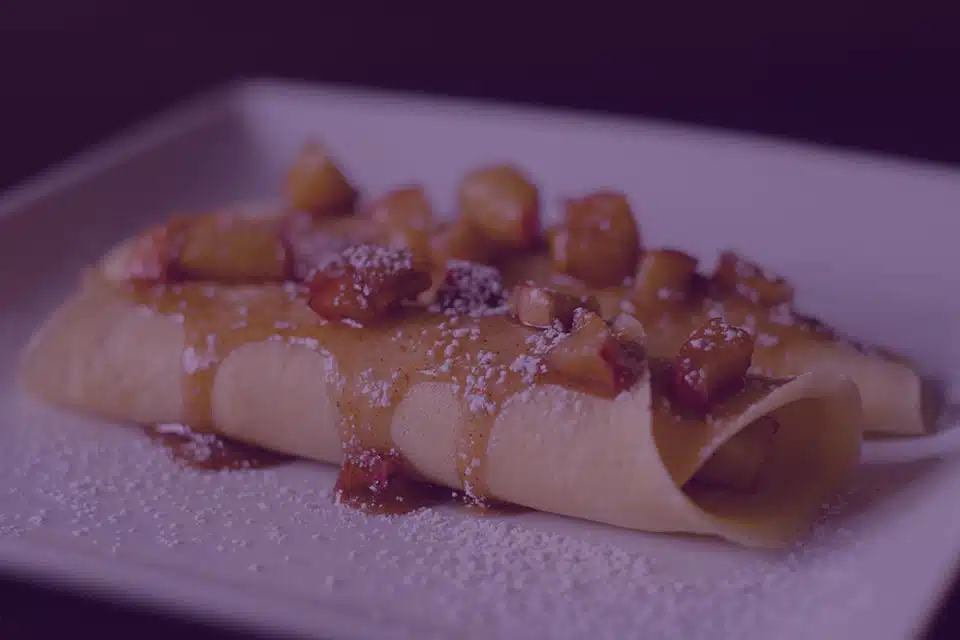 Lay crepe flat on a plate, dust with powdered sugar and add a spoonful of apple filling.