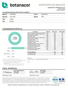 The COA (Certificate of Analysis) documents the cannabinoid profile of the tested product. This includes several types of cannabinoids including but not limited to CBD, CBN, CBG, CBDa, THC, and THCa.