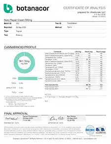 The COA (Certificate of Analysis) documents the cannabinoid profile of the tested product. This includes several types of cannabinoids including but not limited to CBD, CBN, CBG, CBDa, THC, and THCa.