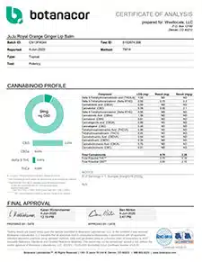 The COA (Certificate of Analysis) documents the cannabinoid profile of the tested product. This includes several types of cannabinoids including but not limited to CBD, CBN, CBG, CBDa, THC, and THCa.